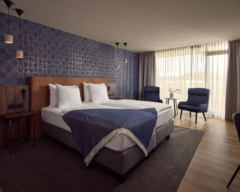 Vinyl flooring in the room and carpet around the double bed (beds á 90cm x 210cm can be separated), wardrobe, safe, flatscreen TV with German, Dutch and international programmes, mini fridge with complimentary mineral water per stay, air conditioning, in-room tablet, balcony or terrace.