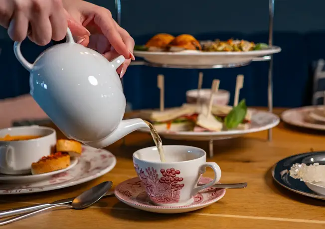 Erleben Sie die elegante Tradition des High Teas, bei dem feine herzhafte und süße Köstlichkeiten auf stilvolle Weise serviert werden.